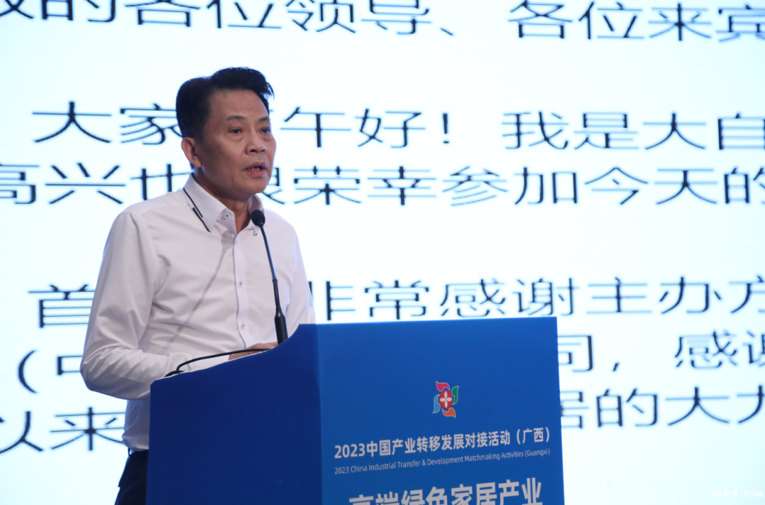 贵港市委书记、市长朱会东在致辞中表示,本次盛会聚焦高端绿色家居产业区域性转移合作,搭建深度合作交流的平台,将有力助推贵港市高端绿色家居产业高端化、智能化、绿色化发展,有力带动兄弟市板材加工业蓬勃发展,为广西工业高质量发展增光添彩。对接活动为贵港与优势省(区、市)和知名企业搭建了深化合作、共谋发展的平台,希望各方共同谱写融合共生、全链协同、聚势增长的行业发展新篇章。
