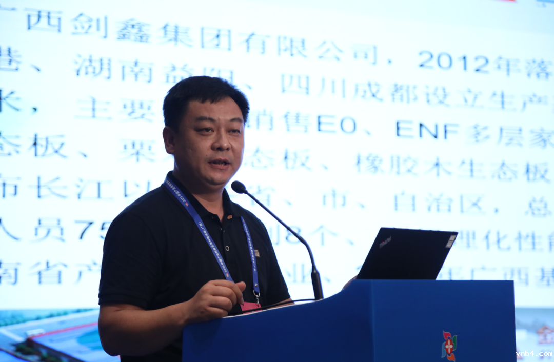 广西剑鑫木业集团有限公司总经理刘波作主题演讲。2012年,集团落户贵港市港南区江南工业园,分别在广西贵港、湖南益阳、四川成都设立生产基地,产品销售遍布长江以南各省、市、自治区。