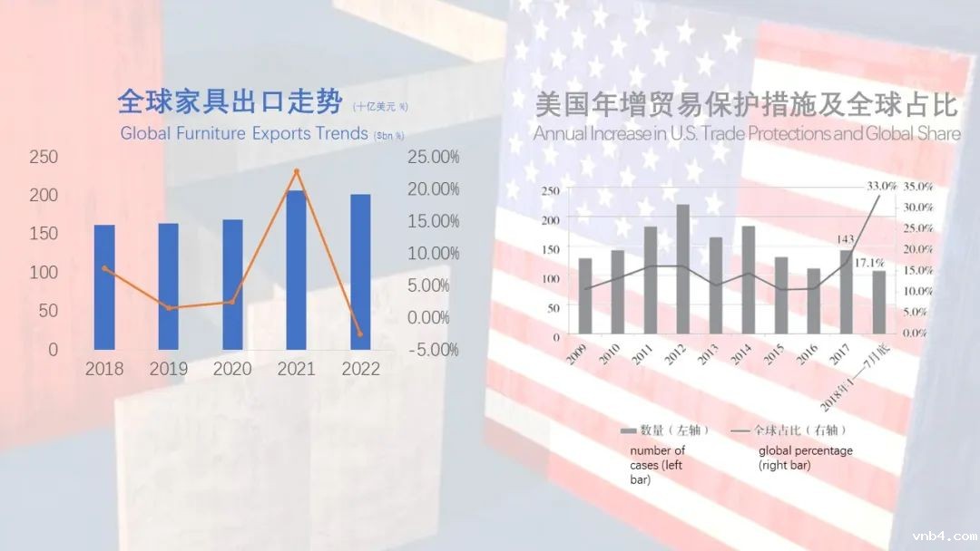 世界两极化不断加深,全球家具行业因此面临新的挑战。首先是全球家具贸易经历了自由化时期的蓬勃发展,开始进入停滞阶段,出口增速下降。美国不断推行市场保护主义,大幅提高了商品交易成本,目前已对中国、越南、墨西哥、波兰、印度尼西亚等多国征收家具关税。