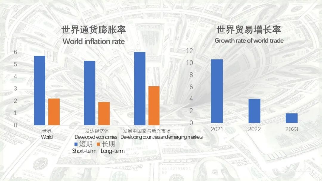 世界产出减少,通货膨胀率及贸易量,也低于近几十年的平均水平。2022年全球CPI通胀率达到7.6%,尽管2023年有望缓和至5.2%,但大多数国家的通胀率仍将超过目标值。全球贸易量2023年预计仅增长1.7%。