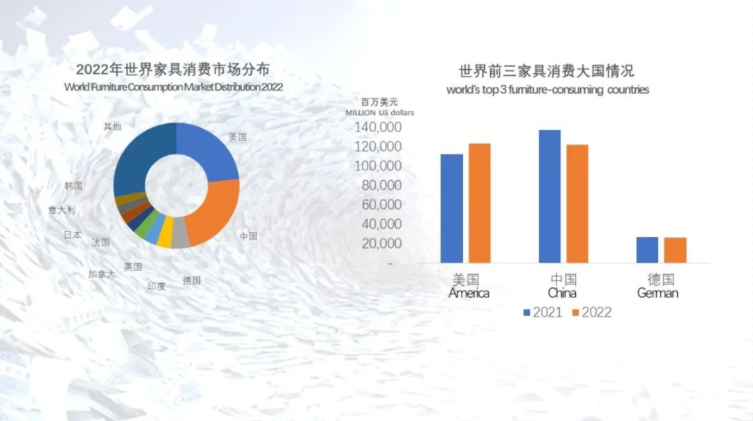 对于这些现状,家具行业在2022年已经有深切感受:全球最大的三个家具市场中,美国的数值增长主要源于高通胀和美元升值;中国消费下滑,德国持平。