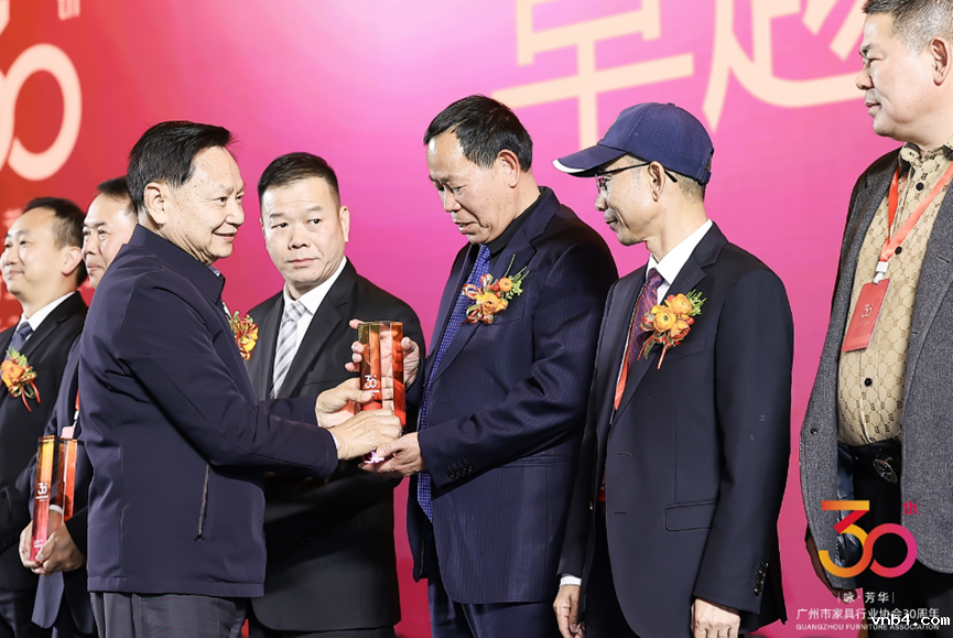 中央编办原副主任、中国轻工业联合会党委书记、会长张崇和为广州市家具行业协会30周年卓越贡献企业颁发奖杯。