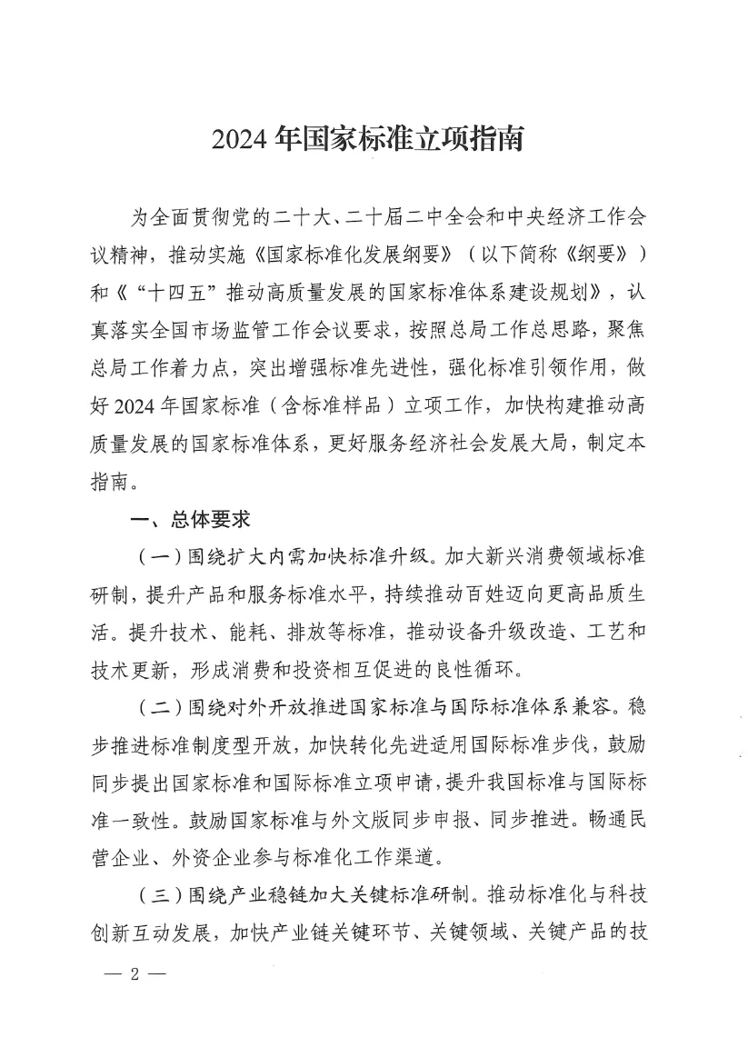 1月12日,国家市场监督管理总局(国家标准化管理委员会)发布关于印发《2024年国家标准立项指南》的通知,其中消费品领域立项重点包括:制修订家用电器、家具、人造板、塑料制品、皮革等大宗消费品质量安全标准;研制集成家电、母婴家电、宠物家电等新家电标准,制定人机交互、纳米材料、直流技术等新技术新材料与家电融合标准;制修订大型通用家具、特殊场所用家具等标准;制定新型纤维材料、功能与智能纺织品等标准;制定婴童和老年等特殊人群、典型场景、用户体验等消费品标准;制定高端医疗装备、新兴医疗设备等医疗器械标准,通知如下。