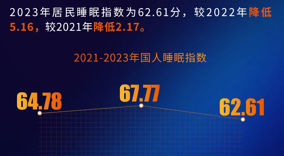 报告调查发现,过去一年人们虽“早睡早起”,但并未让睡眠质量得到实质改善。2023年居民平均入睡时间为23:14,平均起床时间为7:15,入睡时间较2022年提前近半个小时,八点以前起床人群占比为74.5%,高于2022与2021年所占比例。然而,2023年居民睡眠指数为62.61分,较2022年降低了5.16,较2021年降低了2.17;睡眠质量指标变化幅度更大,相比2022年下降了7.51分,相比2021年下降4.8分,均为近三年来最低。