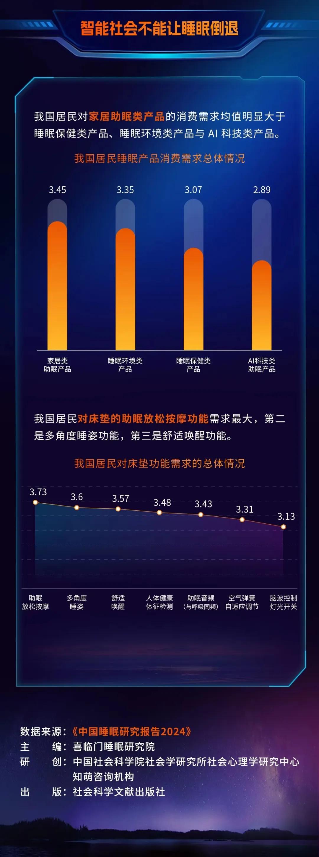 3月19日,由喜临门睡眠研究院主编、中国社会科学院社会学研究所社会心理学研究中心研创、社会科学文献出版社出版的《中国睡眠研究报告2024》(下称“报告”)在北京发布。“健康中国”战略实施背景下,报告以当前最热的人工智能作为切入点,以“智能时代的睡眠健康”为行业新命题,全面分析人工智能时代对于大众睡眠质量的深度影响,针对睡眠焦虑、睡眠产品消费需求、手机成瘾、网络使用对睡眠的影响以及公众对智能睡眠产品和服务需求等进行专题和深度的解读。