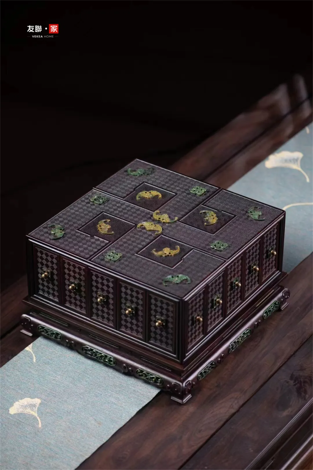 柜体之上,多处地方点缀黄铜錾花装饰,底部承接束腰须弥座式底座,端庄典雅,又彰显出宫廷储器的风范。
