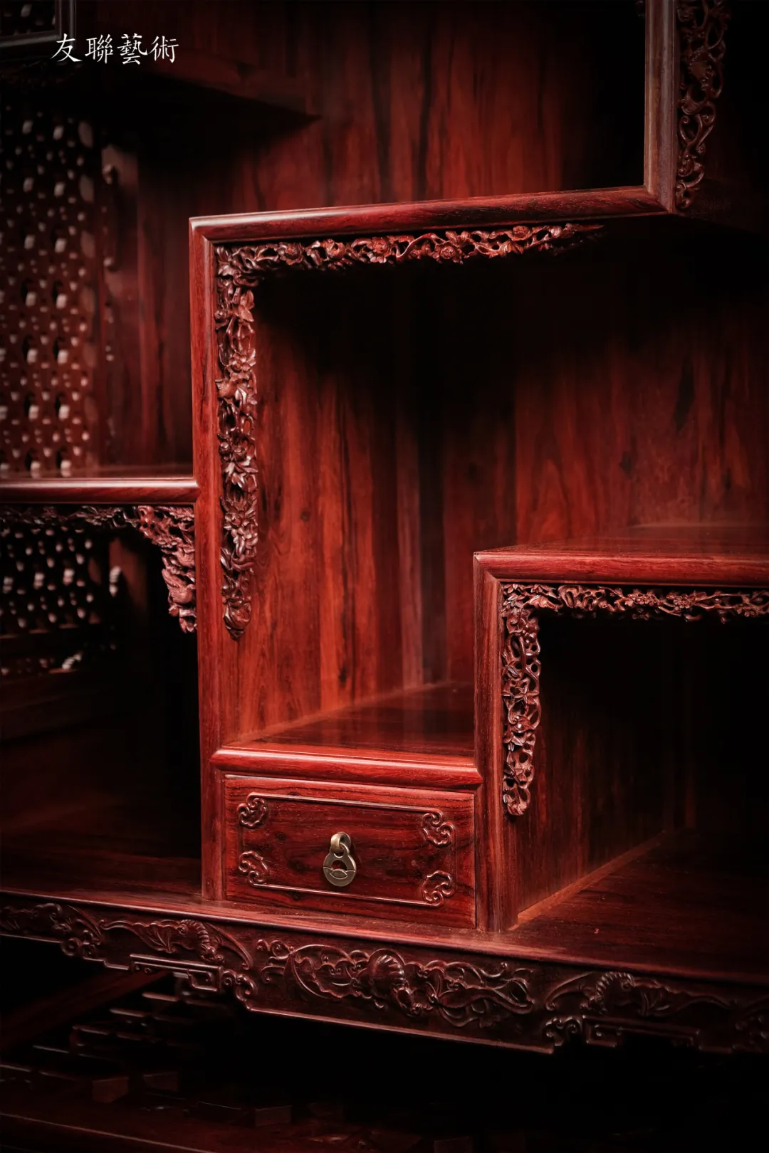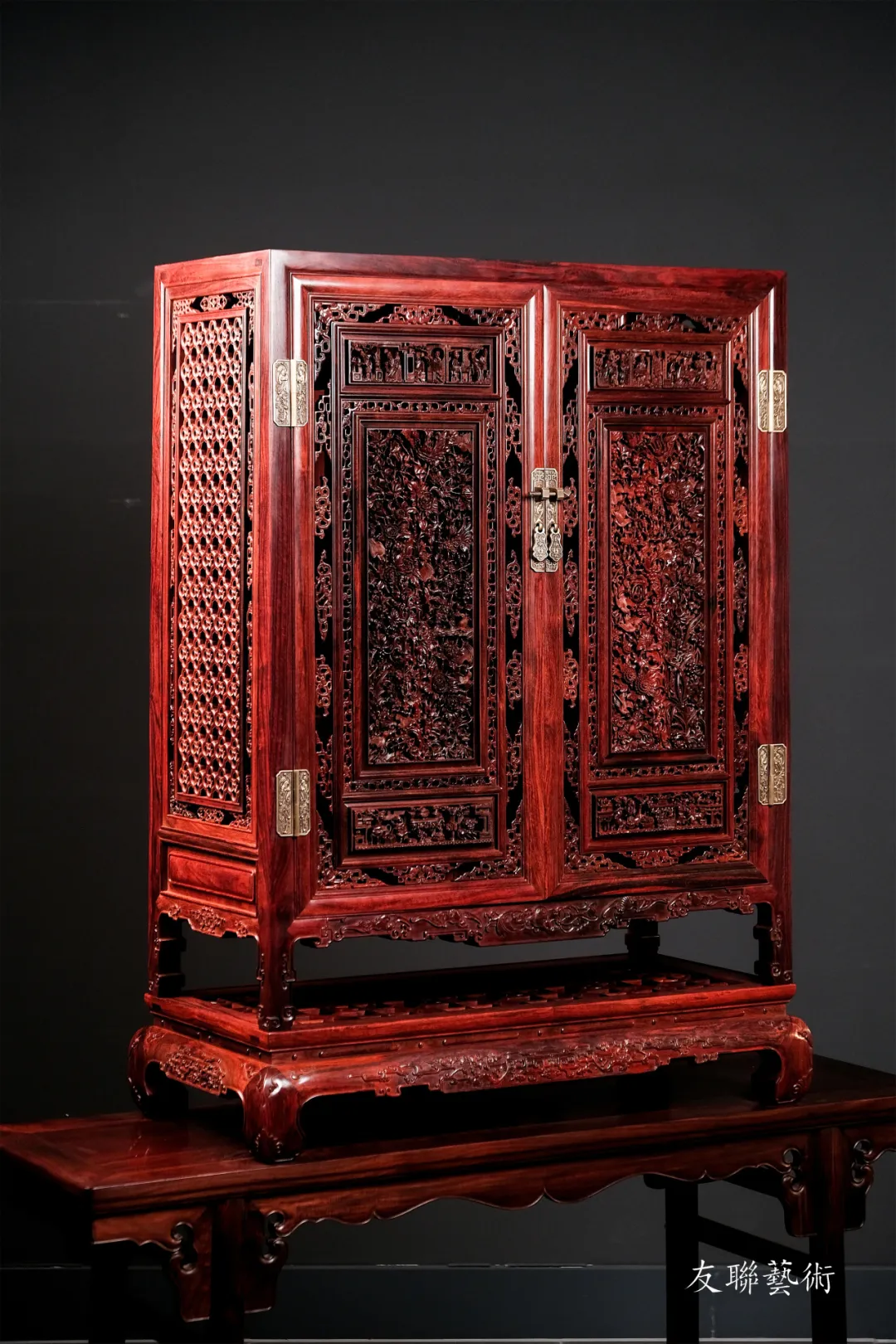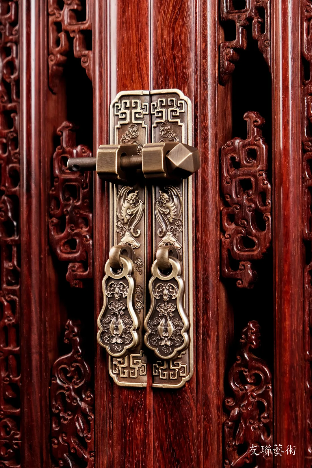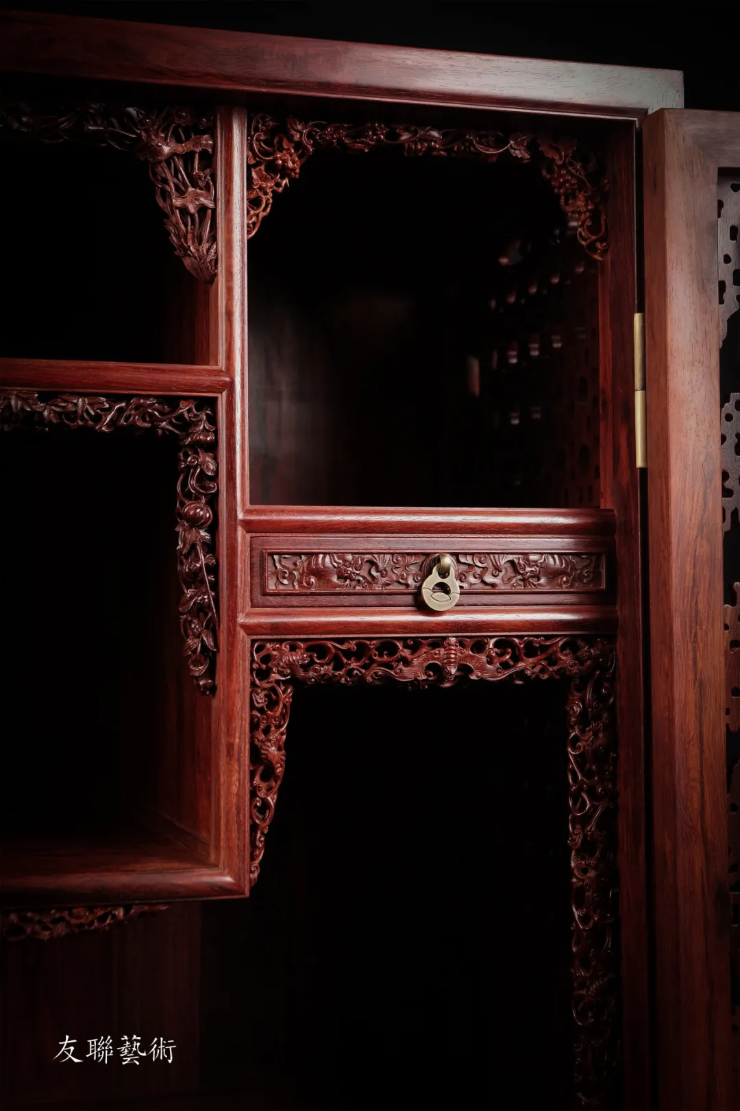 形制规整,柜门设计以三层雕花板攒接而成。外部两圈以透雕为主,镂空雕刻拐子龙纹,繁复精致。两旁则采用镂空窗棂造型,为整体增添了一抹意境之美。