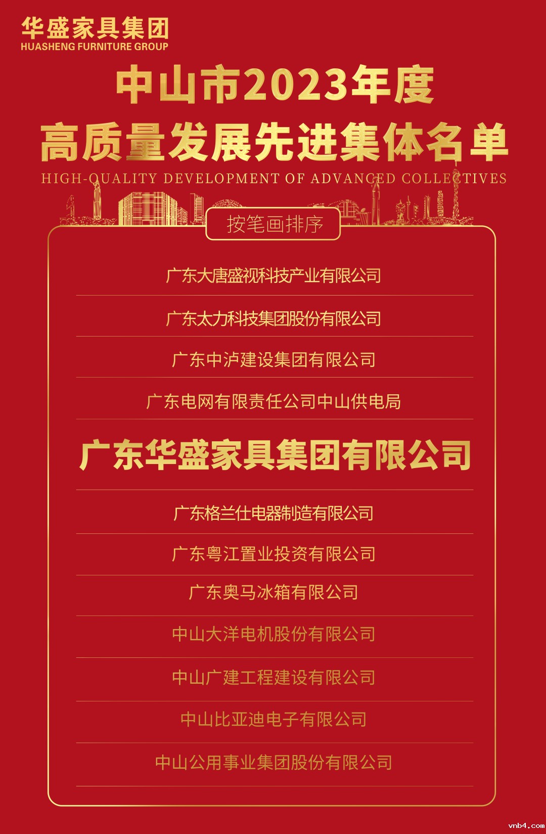 7月30日,中共中山市委、中山市人民政府联合颁布了《关于表彰中山市高质量发展先进集体和先进个人的决定》,华盛家具集团凭借其在推动区域经济迈向高质量发展征途中的突出贡献,荣膺“中山市2023年度高质量发展先进集体”,是中山市家具行业唯一获评单位。