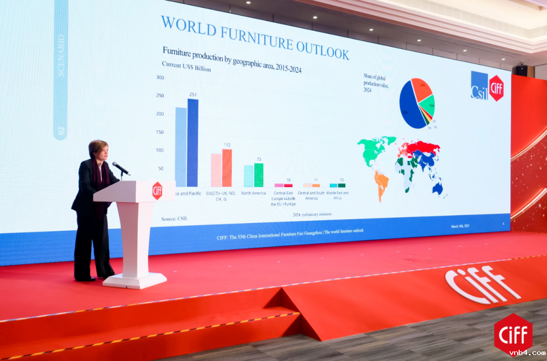 意大利米兰轻工信息中心 CSIL 合伙人兼高级研究员 Giulia Taveggia介绍了全球家具产业发展趋势,预测了各国家地区家具行业潜力。她表示,亚太地区仍将具有最强劲的增长动力,北美市场将逐步复苏。