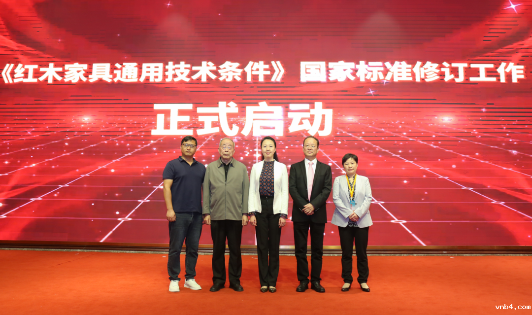 屠祺主任、杨波执行主任、中山市红木家具行业协会顾问曹新民、全国家具标准化技术委员会秘书长罗菊芬、中山市鸿发家具有限公司董事长助理程琛琛共同启动《红木家具通用技术条件》(GB 28010-2011)国家标准修订工作。