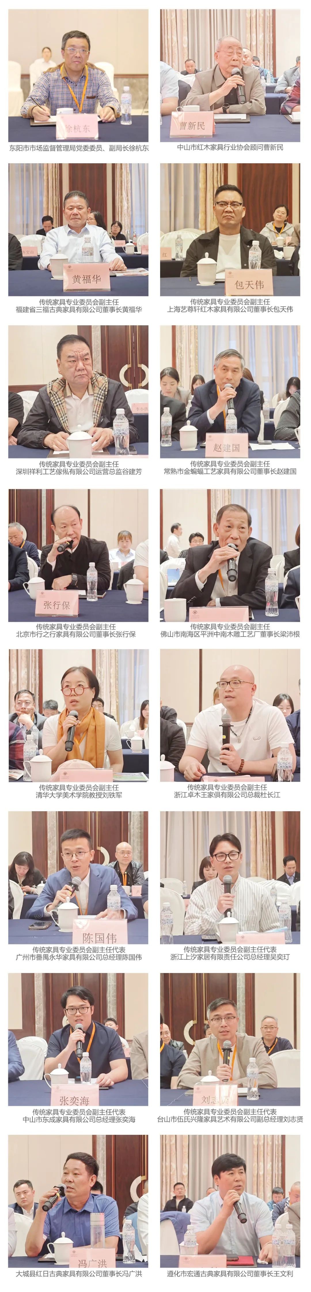 传统家具专业委员会副主任、委员和产区代表交流发言,分享企业经营现状,分析行业发展路径,并就专委会的未来工作提出建议,表示要加强产业间和企业间的交流互动,在标准建设、绿色转型、传承接班、国际宣传、文化出海等方面努力付出,要保持对当前行业新形势的清醒认识,坚定信心、脚踏实地做好企业经营管理,实现长久发展。