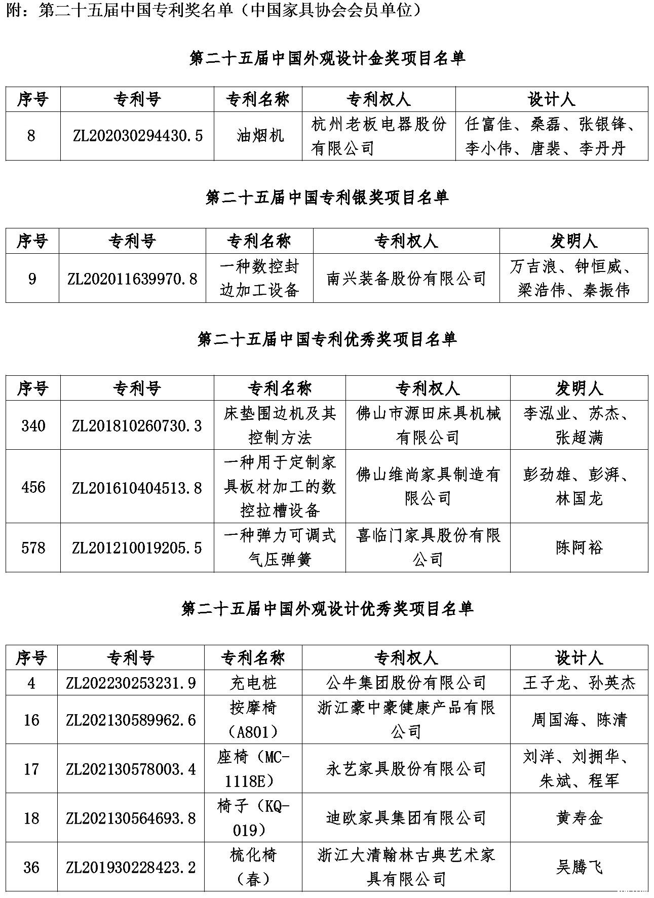 中国专利奖由国家知识产权局与世界知识产权组织共同主办,是我国知识产权领域最高荣誉奖项。家具行业作为民生产业,承载着满足人民美好生活的重要责任。希望获奖企业继续发挥引领作用,带动更多企业加大研发投入力度,提升科技创新能力,在设计、工艺、品牌建设等方面取得更大成绩。