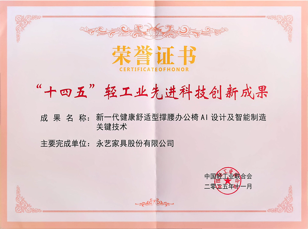 推荐的永艺股份“新一代健康舒适型撑腰办公椅AI设计及智能制造关键技术 ”成果成功入选,成为办公椅行业唯一获奖企业,凸显了永艺股份在座椅行业科技创新领域的引领地位。