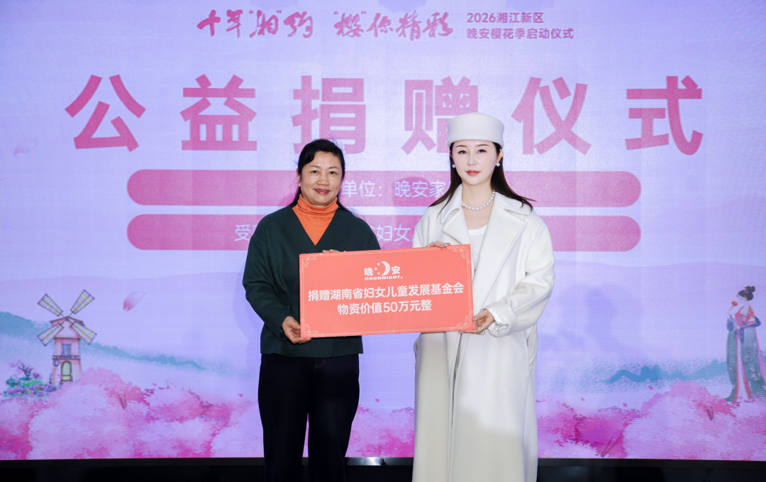 何奕萱董事代表晚安家居集团向湖南省妇联妇女儿童发展基金会捐赠物资价值50万元,由湖南省妇联妇女儿童发展基金会副理事长兼秘书长汤凤英代表受赠。