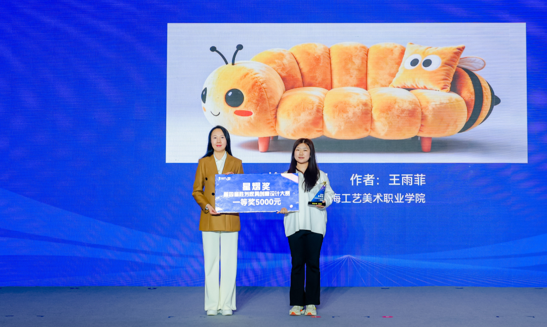 副理事长兼秘书长屠祺为“星熠奖”第四届胜芳家具创意设计大赛一等奖选手颁奖。