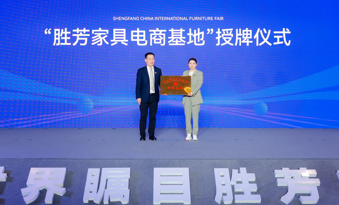 霸州市商务局局长王文刚、中国胜芳国际家具博览中心总裁于世英为胜芳家具产业集群“电商基地”揭牌,标志着胜芳家具产业数字化转型迈出了坚实一步。