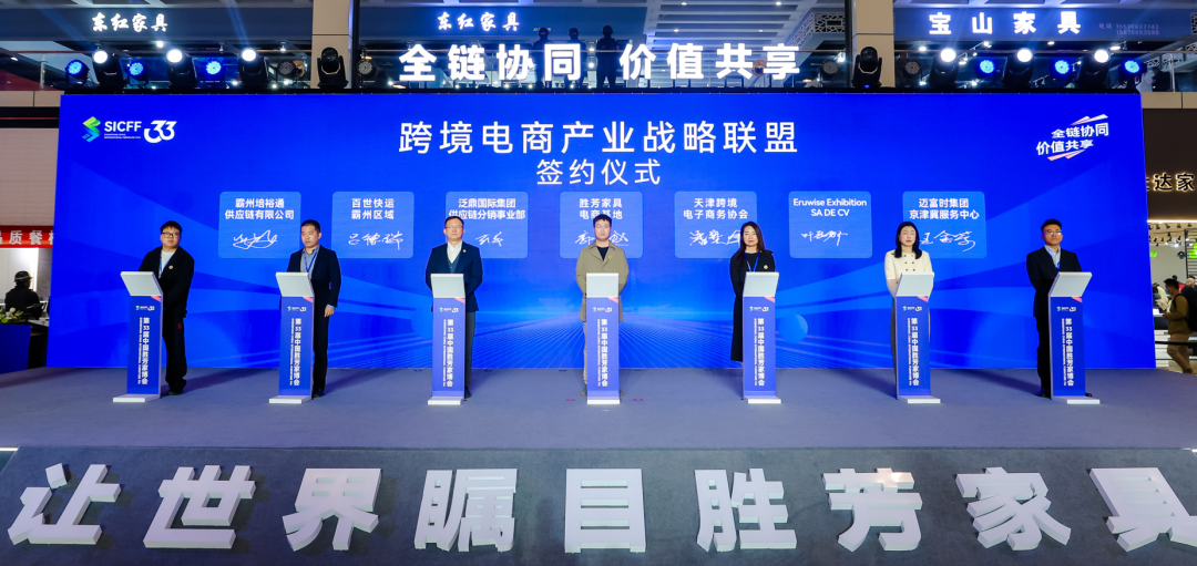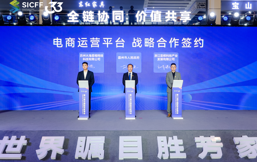在电商基地战略签约仪式中,霸州市政府与浙江菜根科技产业发展有限公司、苏州大海星橙网络科技有限公司进行电商运营平台战略合作签约,胜芳家具电商基地与天津市跨境电子商务协会、泛鼎国际集团、Eruwise Exhibition、百世快运、迈富时集团、霸州培裕通供应链进行跨境电商产业战略联盟签约。签约协议涵盖产品供应链对接、直播电商运营、人才培育、物流配套等多个领域,全方位搭建电商产业生态闭环。